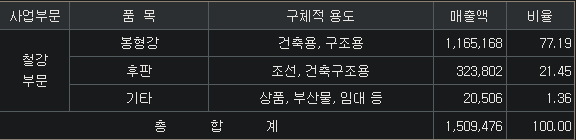 봉형강(77%, 봉강 + H형강=건축기둥,보,지붕), 후판(21%, 6mm이상 두께=선박,교량 등 대형구조물), 기타(2%)