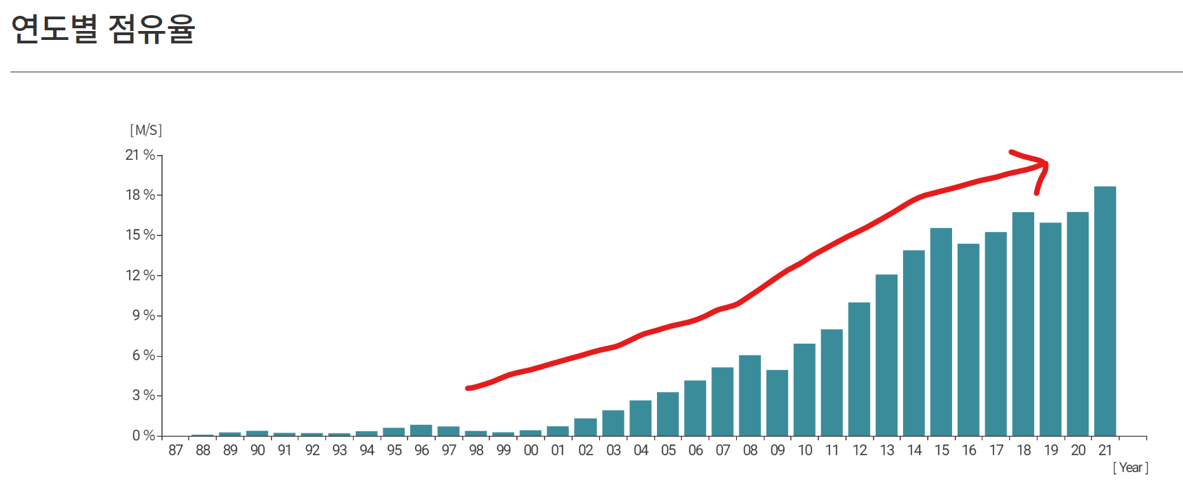 참고로 우리들의 소득이 올라가면서 수입자동차 구입도 점차 증가했습니다. 한국자동차협회에서 발표하는 수입자동차 점유율을 보면 현재 20% 정도에 형성되어 있어요. 길거리에 5대 차량중 1대는 외제차라는 소리죠.