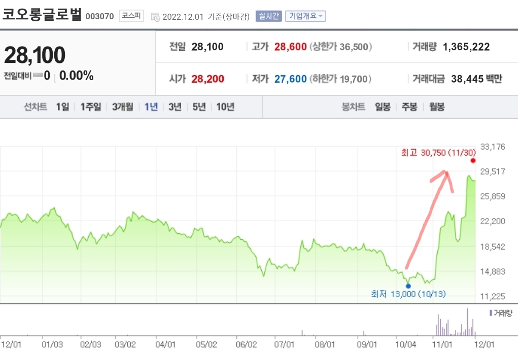 한국정부는 11월4일~11일까지 사우디에 건설사 11곳, 모빌리티사 2곳, IT업체 4곳 등 22개 민간기업으로 구성된 '원팀 코리아'를 꾸려 파견했어요. 이 건설사 11곳 중에 코오롱글로벌이 명단에 들어가 있어서 네옴시티 수혜주로 부각받죠.