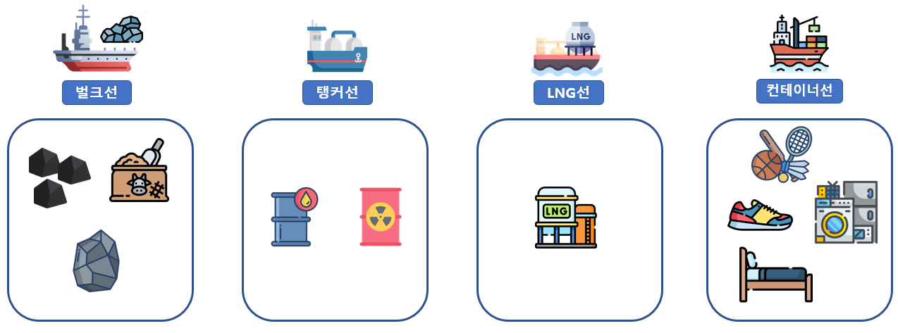 해운업 : 벌크선(석탄, 철광석, 곡물), LNG선(LNG), 탱커선(원유)