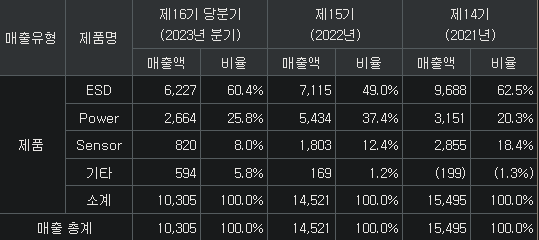 ESD(60%, 고전압으로 인한 정전기방지), Power Diode(26%, 전압,주파수,직류변환), Sensor Diode(8%, 광신호 to 전기신호), Foundry(6%, Si, SiC, GaN 기반=Epi공정)