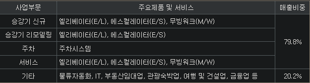 승강기(80%, 엘리베이터, 에스컬레이터, 무빙워크), 기타(20%, 물류자동화설비, 부동산임대, 여행업) / 경쟁력 : 국내 승강기 MS(40%) 1위 / 거래처 : 현대건설, 대우건설, GS건설 등