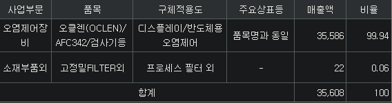 오염제거장비(99%, 반도체=FOUP세정, OLED=FMM세정), 기타(1%, 부품)