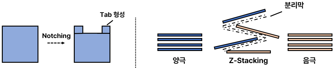 * 노칭(Notching)장비 : Roll형태로 말린 전극을 Sheet형태로(배터리 규격에 맞게) 컷팅 > 예시 : 가로컷팅, Tab 형성, 홈파내기,