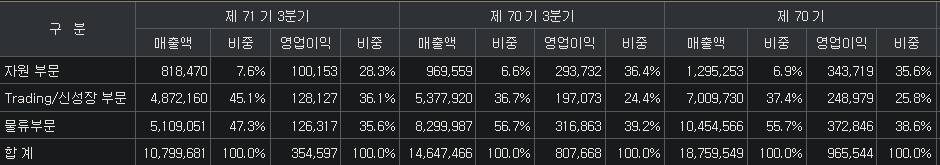* 영업이익비중 / 트레이딩(36%, 메탄올,요소,LCD패널,석회석, IT부품 등), 물류(35%, 포워딩,W&D), 자원(29%, 유연탄, 팜오일) / 경쟁력 : 유리제조 , 바이오연료/ 신사업 : 니켈광산(인도네시아)