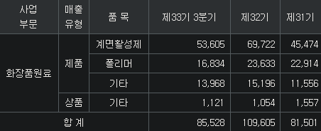 양이온계면활성제(63%, 음이온과 만나 세정=샴푸,린스,세척제), 폴리머( 20%, 고분자 물질=샴푸원료), 기타(17%, MPC유도체=생체친화적세포막=화장품, 임플란트,혈관 스텐트) / R&D : 화장품 원료 / 거래처 : 아모레, LG생활건강, L'oreal, P&G