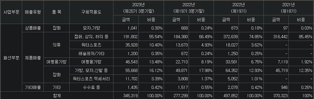 의류(66%, 더내셔널지오그래픽), 잡화(20%, 가방,모자,신발), 여행용가방(13%, 캐리어) / 경쟁력 : 중국진출 / 브랜드 : 내셔널지오그래픽, HEEP, NFL, Brompton