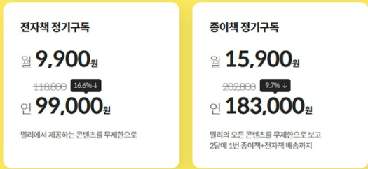 밀리의서재는 국내1위 전자책플랫폼사업자에요. 말 그대로, 전자책을 볼 수 있는 플랫폼인 곳이죠. 동사는 구독권 형태로 수익을 올리고 있습니다. 매월, 매년 결제하는 방식으로 구독권을 판매하고 있죠.