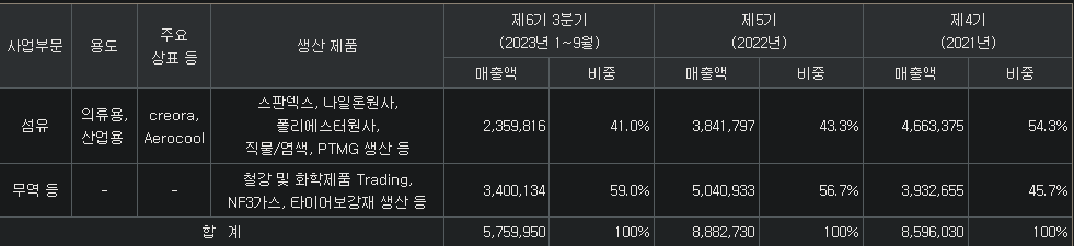 섬유(41%, 스판덱스, 나일론원사, 폴리에스터원사, PTMG), 무역(59%, 트레이딩=철강,화학, 생산=타이어보강재, NF3) / 경쟁력 : 스판덱스 글로벌MS 1위 / 생산지역 : 국내, 베트남, 중국, 이스탄불, 인도, 브라질