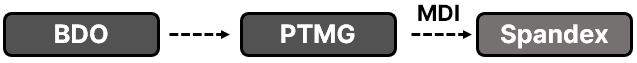스판덱스는 BOD, MDI를 원재료로 사용해요. 구체적으로 말하자면, 원재료 BDO(Butadiene Dioxide)로 PTMG를 만들어요. 그리고, PTMG에 MDI를 첨가하면 스판덱스(Spandex)가 되는 것이죠.