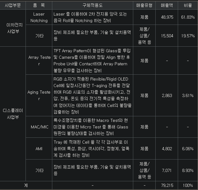 노칭장비(82%, 전극 레이저컷팅), 디스플레이검사장비(18%) / 거래처 LGES