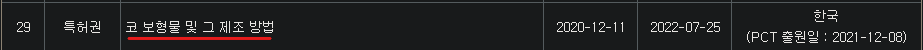 미적기준이 서양기준에 맞추어져있다보니, 서양인의 높은 코를 원하는 사람들이 많죠. 그래서, 코수술 진행건수도 계속해서 증가하고 있어요. 코보형물로 가장 보편적으로 쓰이는 것이 실리콘입니다. 앞서 말했듯, 실리콘은 인체 안에 들어가도 무해할 확률이 매우높기 때문에 주로 쓰인다고 했는데요. 동사의 아래 R&D를 보면, 코보형물 특허출원을 한 것을 알 수 있어요.