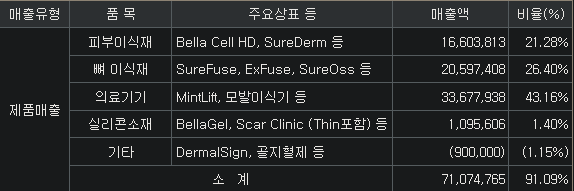 의료기기(43%, 리프팅실=주름개선, 모발이식기), 피부이식재(21%, 외상,화상,욕창), 뼈이식재(26%, 성형수술,임플란트, 정형외과), 실리콘소재(1%, 인공유방보형물, 창상피복재) / 신사업 : 중국JV(로열티3~5% 수령) / R&D : 관절용 재생치료제
