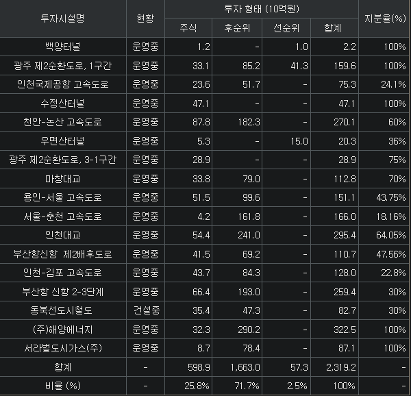 1. 인프라펀드 : SOC(Social Overhead Capital, 사회간접자본) 투자 > 포트폴리오 : 13개 유료도로, 1개 항만, 1개 도시철도, 2개 도시가스