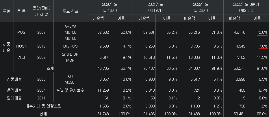 POS(73%, Point Of Sale), 키오스크(8%, Kiosk), 기타(19%, 카드리더기, A/S), / 경쟁력 : POS기기 수출비중(미국,이탈리아,일본,이스라엘 등)