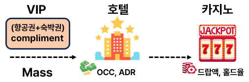 참고로, 카지노에 찾아오는 외국인 마다 배팅액이 다르겠죠. 일정 금액 이상을 쓰는 관광객을 VIP로 분류를 하는데요. 백화점과 마찬가지로 카지노산업도 VIP 비중이 굉장히 중요해요. 대부분의 매출을 차지하기 때문이죠. 그래서, VIP를 모집, 관리하는 것이 핵심인데, 여기에 프로모션 같은 비용이 수반돼요. 이를 콤프(Compliment)라고 부르는데요. 콤프란 항공권, 숙박권 등 VIP 관광객을 대상으로 지출하는 마케팅 비용이라고 이해하면 돼요.
