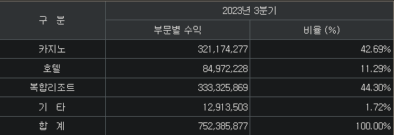 카지노(43%, VIP, Mass), 복합리조트(44%), 호텔(11%), 기타(2%) / 영업지역 : 서울(광진구 워커힐), 인천, 부산, 제주(메종글래드 호텔), 미국 Orlendo(호텔)