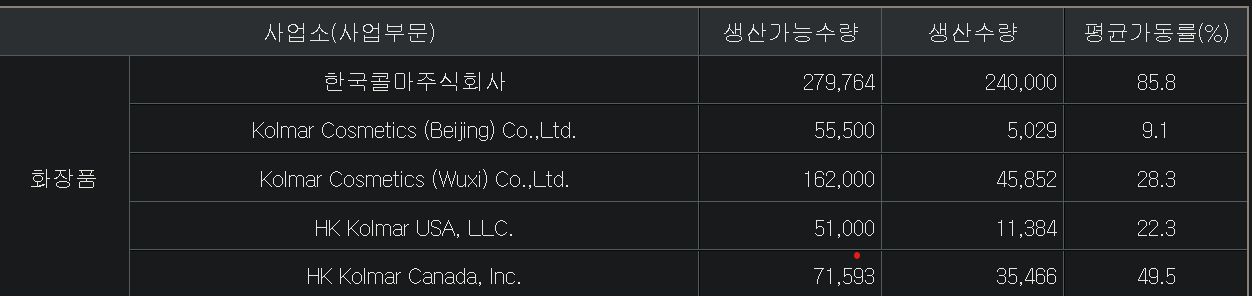 1. 한국 화장품소비 영향 : 한국콜마주식회사 한국에 위치 / 비중 : 45% (생산가능수량 기준)