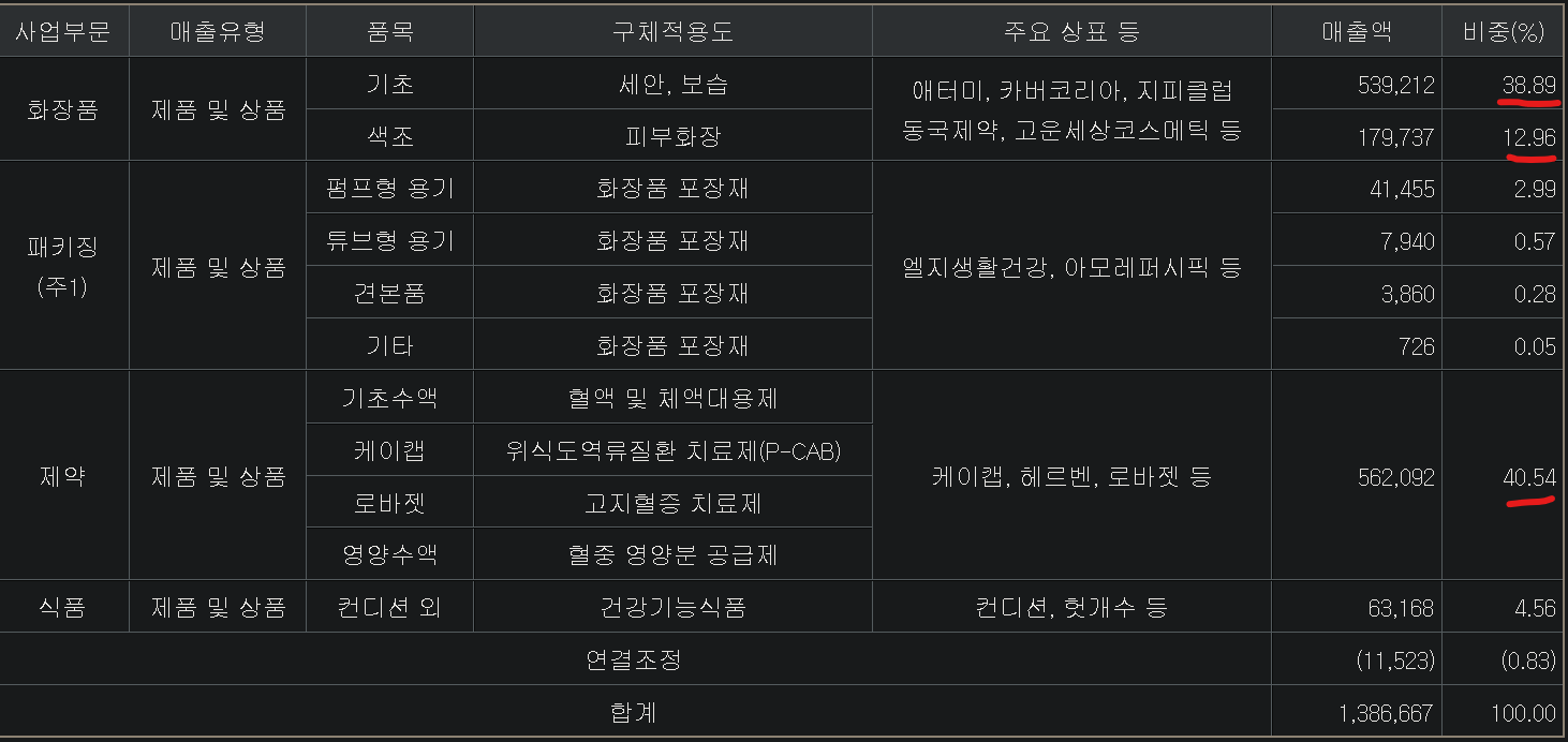 하지만, 제약부문도 만만치 않습니다. 무려 42%를 차지해요. 당사를 화장품ODM 업체라고만 지칭하기에는 무리가 있는 것이죠.