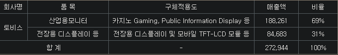 토비스는 카지노게임기용 모니터를 주력으로 만들고 있어요. 일반 디스플레이와 다르게 카지노게임기 모니터는 화면이 훨씬 크고 유연한 디스플레이가 요구돼요. 동사는 카지노게임기 제조업체(ex : 미국 IGT)에 모니터를 판매하죠. 뿐만 아니라, 동사는 산업용 디스플레이로 의료용 모니터, 키오스크용 모니터, 주문제작형 모니터 등 모니터가 필요한 곳 대부분을 대처할 수 있는 역량이 있어요.