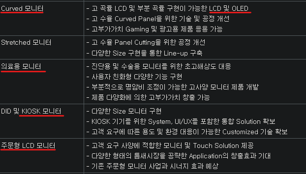 1. 산업용 모니터 : 카지노게임기, 의료용 모니터, 키오스크 모니터, 주문제작형 모니터