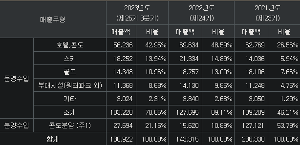 운영(79%, 호텔&콘도, 스키장, 골프장, 워터파크 등), 분양(21%, 콘도 분양)