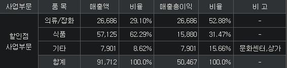 의류&잡화(29%), 식품(62%), 기타(9%, 문화센터운영) / 거래처 : 중산층, 서민층 / 경쟁력 : 백화점형 의류&잡화 판매 + 대형마트형 식품 할인판매 / 판매지역 : 노원, 성남, 광명, 대전, 부천, 전주