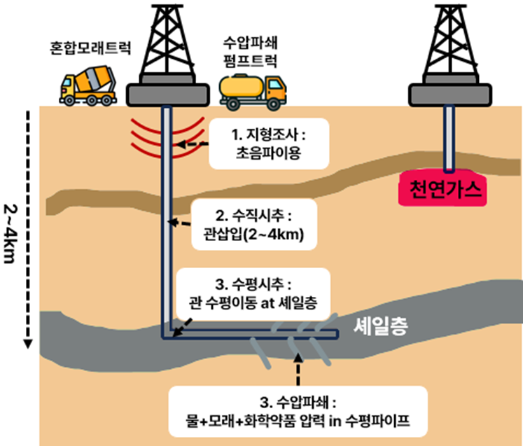 * 수압파쇄 : 압력(물+모래+화학약품) > 수평파이프 구멍(콘크리트)을 통해 분출 > 셰일층 파괴 > 시추