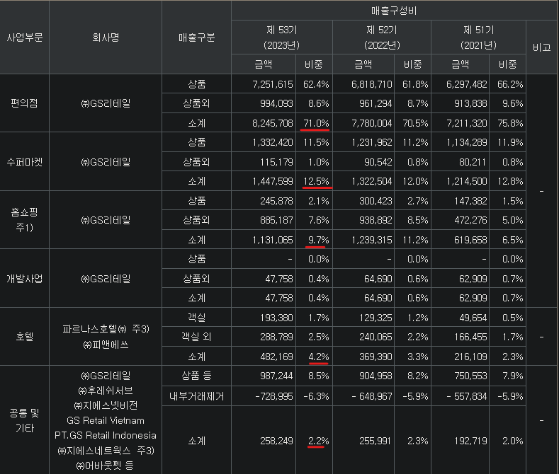 편의점(71%, GS25), 수퍼마켓(13%, GS THE FRESH), 홈쇼핑(10%, GS SHOP), 호텔(4%, 파르나스, 나인트리), 기타(2%) / 경쟁력 : 해외진출(베트남, 몽골) / 자회사 : GS네트웍스(물류)