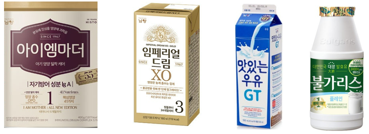 우유 : 맛있는우유GT, 불가리스(가공유), 초코에몽 등