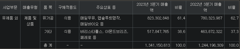 유가공식품(61%, 매일우유, 앱솔루트분유, 치즈, 요거트), 기타(39%, 커피=바리스타, 가공유=허쉬우유, 단백질우유, 페레로=수입)