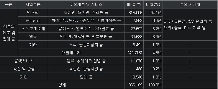 면&스낵(91%, 라면=삼양라면, 불닭볶음면, 스낵=짱구,사또밥), 소스류(3%) 냉동(3%, 만두, 떡갈비), 기타(3%, 축산, 관광=삼양목장) / 생산지역 : 국내 / 자회사 : 삼양스퀘어팩(골판지상자), 삼양로지스틱스(물류), 삼양제분(밀가루)