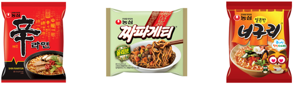 라면(75%, 신라면, 짜파게티, 너구리 등), 스낵(14%, 양파링, 새우깡, 꿀꽈배기 등), 음료(11%, 탄산음료=웰치스, 먹는샘물=백산수), 기타( / 생산지역 : 국내, 미국, 중국