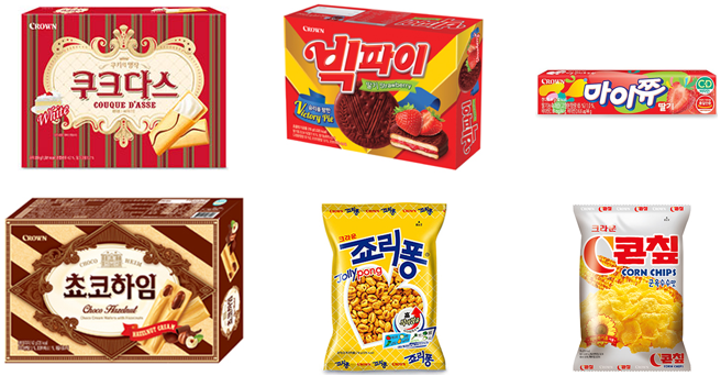 크라운제과는 사명에서도 알 수 있듯이, '제과'사업을 하고 있는 업체에요. 제과는 '과자를 만드는 것'을 뜻하죠. 크라운제과하면, 떠오르는 과자들은 비스킷(초코하임, 쿠쿠다스, 버터와플, 크라운산도), 파이(빅파이), 스낵(콘초, 죠리퐁, 콘칲), 캔디(마이쮸, 새콤달콤) 등이 있어요. 대한민국 사람이라면 한 번쯤 다 먹어봤을 제품들이 많이있죠.