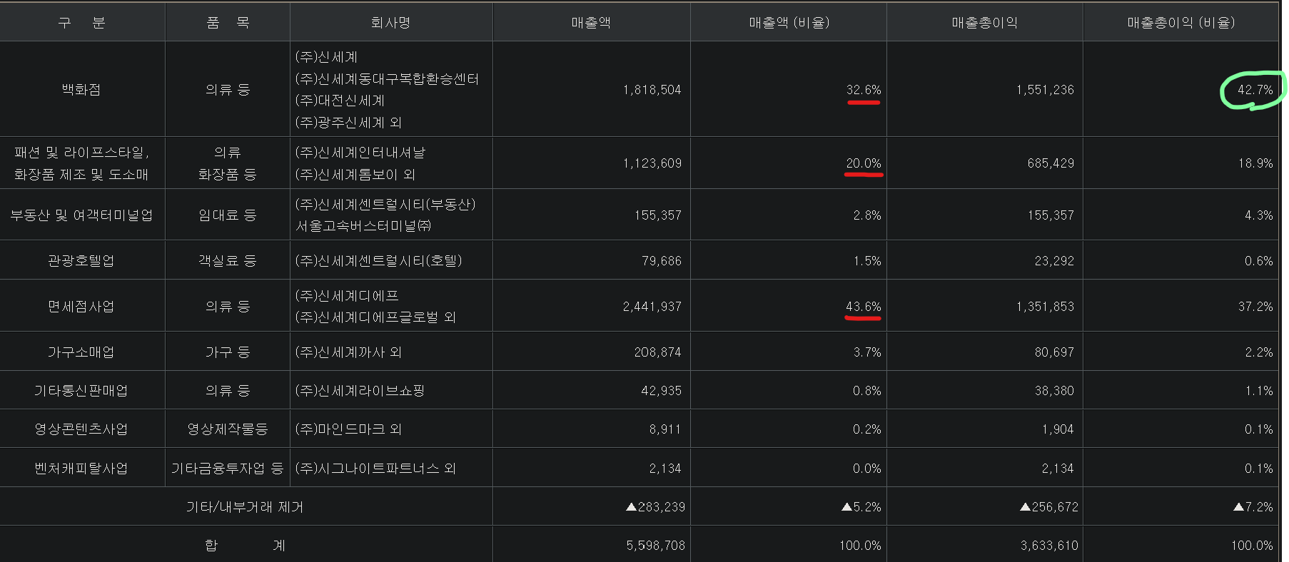 물론, 직접 구매하여 판매하기도 합니다. 예로, 자회사 신세계인터내셔날이 해외수입브랜드를 수입해와 파는 유통마진은 매출액으로 찍히죠. 아무튼, 이렇게 짭잘한 수익이 신세계그룹의 60~70%정도 형성되어있어요.아래 표는 신세계동대구복합환승센터, 대전신세계 매출구분이에요. 신세계는 13개 정도 백화점을 운영하고 있어요. 한 예시로 동대구점신세계, 대전신세계을 가져왔으며, 다른 지점들도 비슷한 상품매출, 임대수익 비중을 가지고 있습니다.