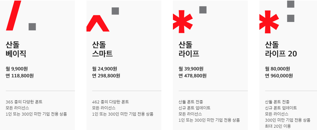 클라우드형 폰트 플랫폼 : 산돌구름(월간 or 연간 구독 for 폰트사용) > 사용처 : 자막, 웹사이트, 앱, 기업