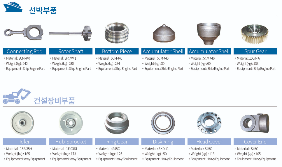 중&대형선박엔진부품(66%, 배기밸브 스핀들 for 배기가스 배출, 밸브 시트 for 가스 누출방지), 형단조(19%, 정해진 금형틀 for 대량생산), 기타(15%, 수입상품유통)