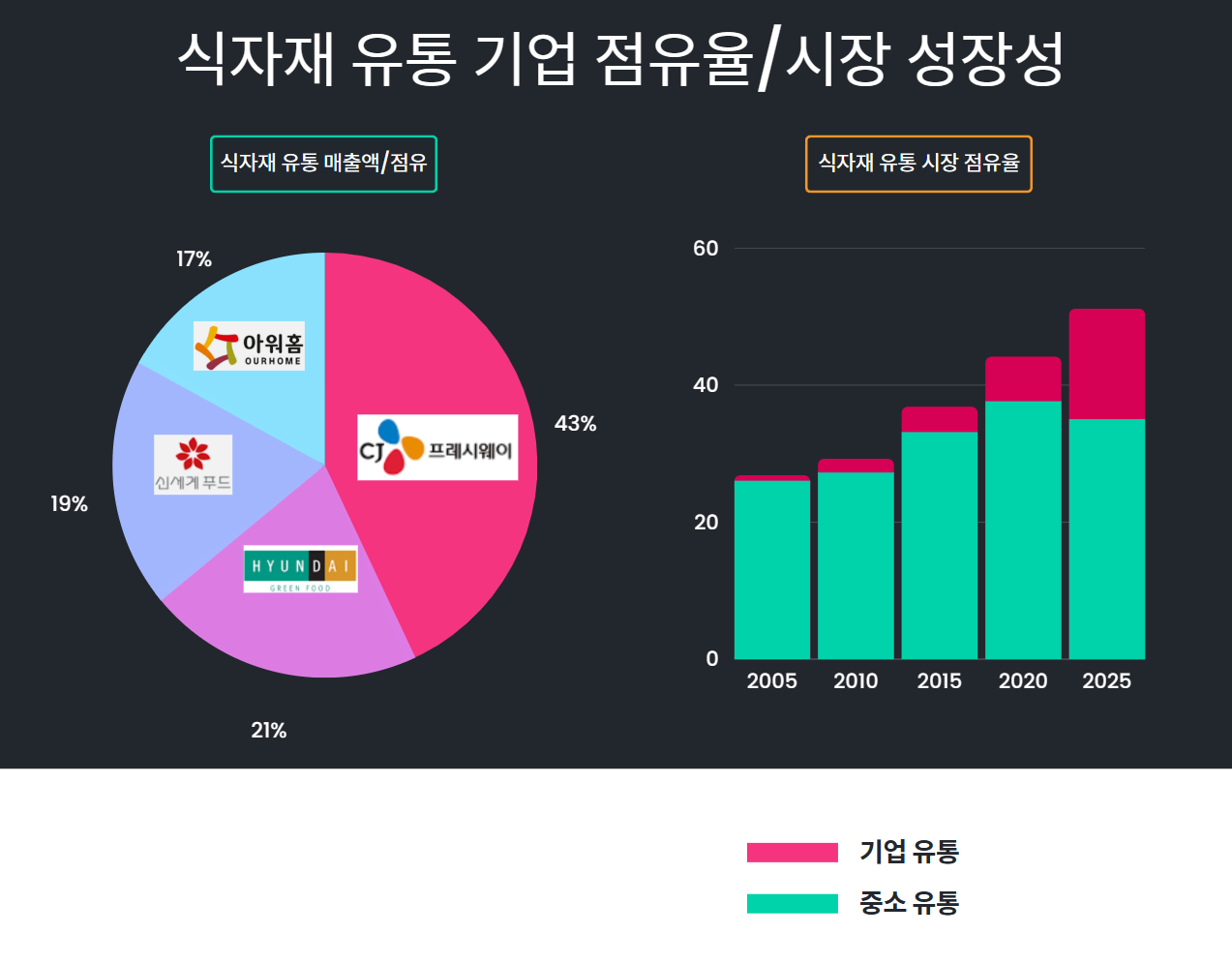 120여명의 상품 전문 MD가 전국 주요 농산물 산지 직거래를 통해 안정적으로 식재료를 공급하며CJ프레시웨이는 전국 5개의 물류센터를 중심으로 하는 국내 최대 규모의 콜드체인 유통망을 바탕으로식품대리점, 급식업체, 체인레스토랑, 일반식당, 호텔 등에식당사업에 필요한 24,000여종의 상품을 공급하고 있습니다. 보관기간도 짧고, 보관시설도 잘 갖춰야하는 식재료, 맛으로 승부하며식재료가 맛의 품질을 바꾼다고 생각하는 음식점은 판매가 대비 최소 39%를 신선한 식재료 매입에 신경쓴다.이것을 여태까지 시설조차 제대로 갖추지 않은 중소유통상들이 90%를 점유하고 있었지만 현재 기업형 식자재 유통업체들이 빠르게점유율을 높이고 있다. 현재 10%의 수준에서 2025년에는 32%까지 확대될 전망이다.