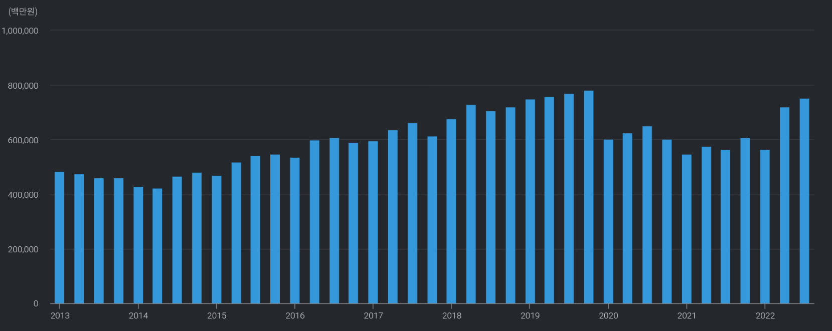 분기별 매출액으로 봤을때 최고 수준인 2019년 3,055,080 의 근사치인 2022년 2,715,834(단순 분기값 추정)로 추정되며 2분기3분기가 안정적으로 상승하고 있음에 따라 4분기도 안정적으로 상승한다면 최고 매출액도 기대되는 상황이다.