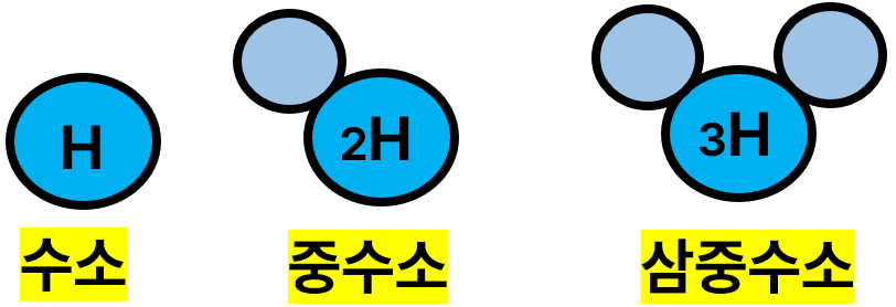 * 수소종류 : 일반수소(양성자1), 중수소(양성자1,중성자1), 삼중수소(양성자1,중성자2)