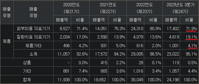 레이저 피부미용 의료기기(72%, 진피, 표피, 문신제거), 레이저 질환치료 의료기기(19%, 아토피, 백반증, 원형탈모 등), 기타(9%) / R&D : 질환치료 의료기기(혈관병변, 요로결석), 초음파기기
