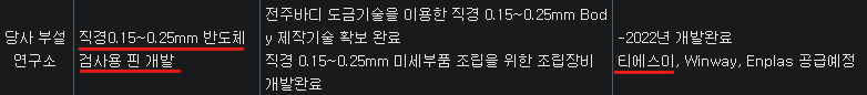 점차, 반도체가 미세화되면서 포고핀 역시 얇아져야만 해요. 메가터치의 아래 R&D 내역을 보면, 직경 0.15~0.25mm의 포고핀 개발을 한 것으로 보여요. 이렇게 미세화된 포고핀을 동사의 모회사이자 테스트 소켓을 만드는 '티에스이'에 납품하고 있습니다.