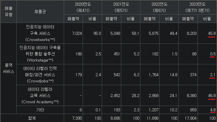 데이터라벨링(46%, 수집-가공-전달 for 모델), 데이터라벨러 교육(47%, B2C), 라벨러 인력매칭(2%, 거래처에 라벨러 매칭&파견), 라벨링 도구(1%, 라벨링 툴 제공 for 거래처=데이터 유출 원치x), 기타(4%)