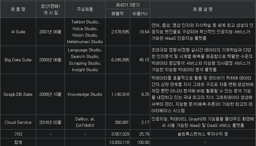 빅데이터 솔루션(45%, AI 모델 구축=LLM,검색,인사이트,스크래핑), AIaaS(19%, AI as a Service for 객체인식, 챗봇, 메타휴먼=아나운서 등), 빅데이터 시각화(8%), 클라우드(2%), 기타(26%, 솔트룩스벤처스 투자수익) / 경쟁력 : 거래처(공공기관, 금융, 제조, 유통 등)