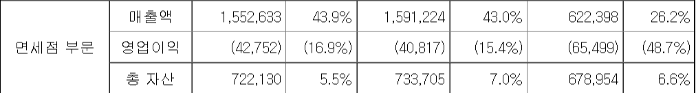 현대백화점 면세시장의 경우 영업 손실이 계속해서 발생하고 있습니다. 면세 사업의 경우 국가에서 부여하는 운영 특허를 획득한 사업자에게 관세 및 내국세(부가세, 개별소비세, 농특세, 교육세, 주세 등 ) 과세가 면제된 보세화물을 지정된 장소에 판매하는 사업이며 더 현대의 경우 서울지역 시내 면세권 18년(만료 23년 10월), 20년(만료 25년 2월) 각 획득, 20년에 공항 면세 DF7구역(25년 8월만료)의 권한을 가지고 있습니다.