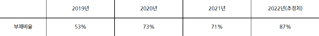 부채율은 해가 지날수록 증가하고 있지만 타 기업들과 비교시 양호한 수준의 비율입니다.