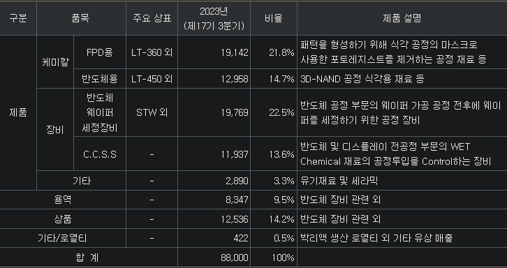 FPD소재(22%, Stripper, Thinner), 반도체소재(15%, 세정액, 식각액 for NAND), 반도체장비(23%, 웨이퍼습식세정장비), C.C.S.S(14%), 기타(26%, 용역 등) / 자회사 : 엘티씨에이엠(C.C.S.S, 세정액, 식각액 for NAND, DRAM), 엘에스이(웨이퍼세정장비) / 거래처 : SDC / R&D : SOFC(Solid Oxide FC) 전해질+분리막