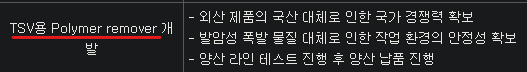 AI향으로 HBM(High Bandwidth Memory)가 굉장히 뜨겁죠. HBM의 핵심 기술 중 하나가 TSV(Through Silicon Via)인데요. TSV란 이름 그대로 적층된 DRAM들을 서로 이어주기 위해서 웨이퍼(Silicon)에 구멍(Via)을 뚫는 것을 의미해요. 이때, 구멍을 뚫을 때, 습식, 건식방식 모두 불순물을 남기는데요. 화학물질이다 보니 '폴리머(Polymer)'라고도 불러요. 이러한 폴리머를 제거해주는 장비를 개발하고 있는 것으로 보여요.