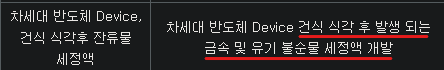 1. 반도체 & 디스플레 소재 : 식각액(Wet Etchant, 불소F 사용 for 산화막제거), 박리액(Stripper, PR제거 after 식각공정), 세정액(Cleaning, 불순물제거), HYCL(증착액, 질화막 제거 in 화합물반도체)