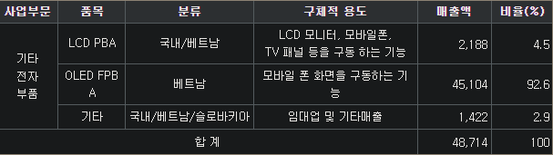 FPBA(93%, Flexible PCB Board Assembly for OLED), PBA(4%, 칩, 수동소자 실장 on PCB for LCD), 기타(3%) / 거래처 : SDC(애플향) / 생산지역 : 베트남